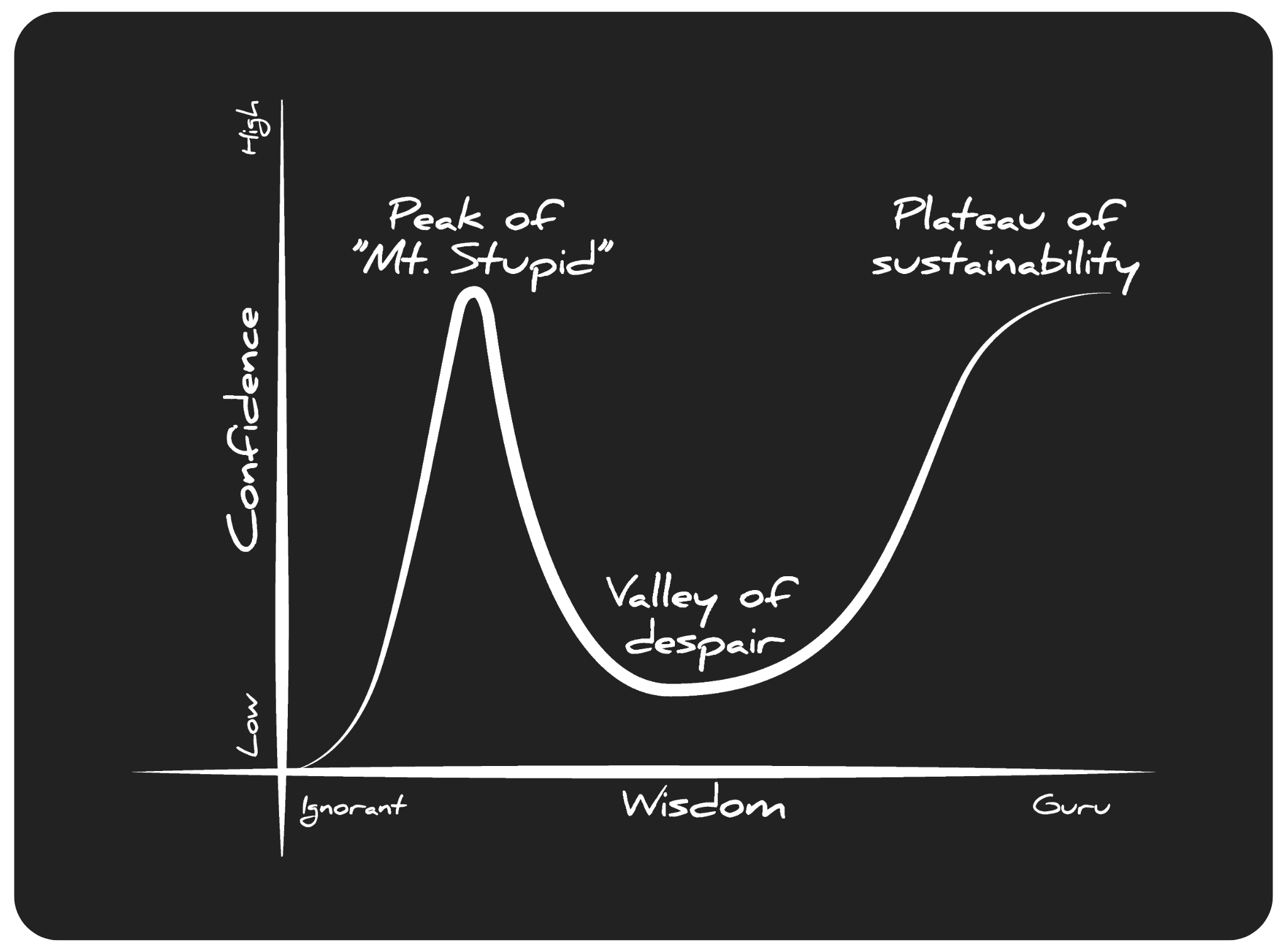 Enter the Dunning–Kruger Effect: A curve where your confidence shoots up before your competence does. That’s when the dip hits. You suddenly notice everything you’re bad at. Progress slows. You feel exposed. This is where most people quietly bow out, not because they’re incapable, but because that drop in confidence hurts.